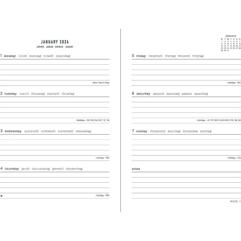 Esta linda agenda Letts of London Conscious A5 2024 tem o formato de uma semana à vista. Possui muitos detalhes sustentáveis. A capa dura é feita de poliéster a partir de garrafas PET recicladas. A capa possui cantos arredondados. Cola vegan é usada na agenda. As páginas da agenda são impressas com tinta de soja em papel 100% reciclado, e vai de janeiro a dezembro de 2024. Há um calendário mensal antes de cada mês e páginas de tarefas e notas no final de cada mês. Além das páginas da agenda, existem muitas outras páginas de informações, incluindo metas pessoais anuais, lista de projetos e viagens, datas especiais mensais, contatos, conversões, etc. Tamanho da página 210 mm x 148 mm.