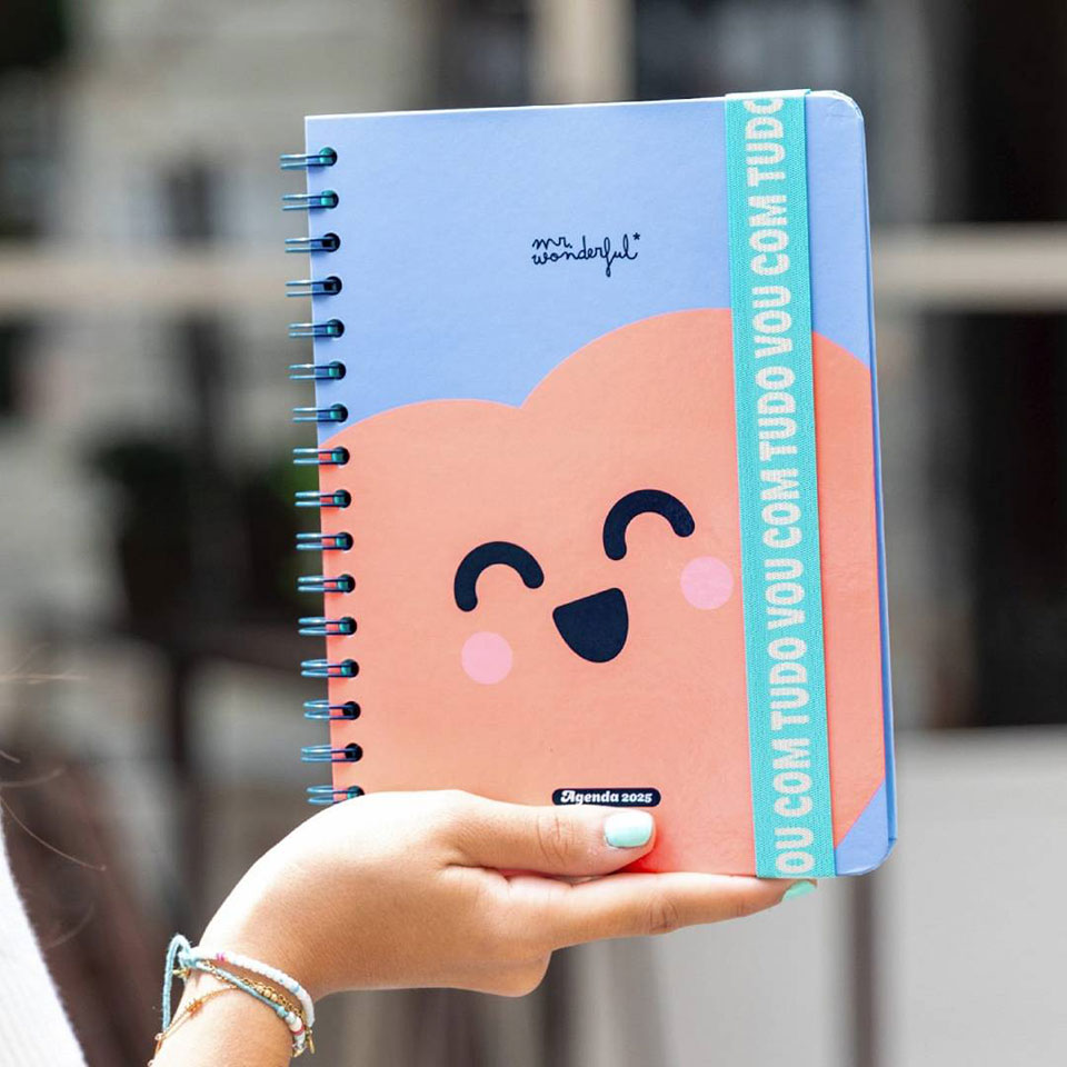 Agenda estilo Wonder da Mr. Wonderful, com organização semanal, vai de janeiro a dezembro de 2025. Esta agenda contém: 160 páginas de papel de 100 g com a certificação FSC, Frases diárias motivacionais, Separadores com aba para cada mês, Compartimento interior de cartão, Régua de plástico interior, 8 folhas de autocolantes, Jogos e extras espetaculares, Horários e calendários de 2025 e 2026, Playlist exclusiva, Páginas para apontar contactos, Tabelas de poupança, Fecho com elástico, Blocos de notas adesivas com formas, Organizador mensal no início de cada mês, Frases mensais superdivertidas. Faz com que cada dia seja melhor do que o anterior!