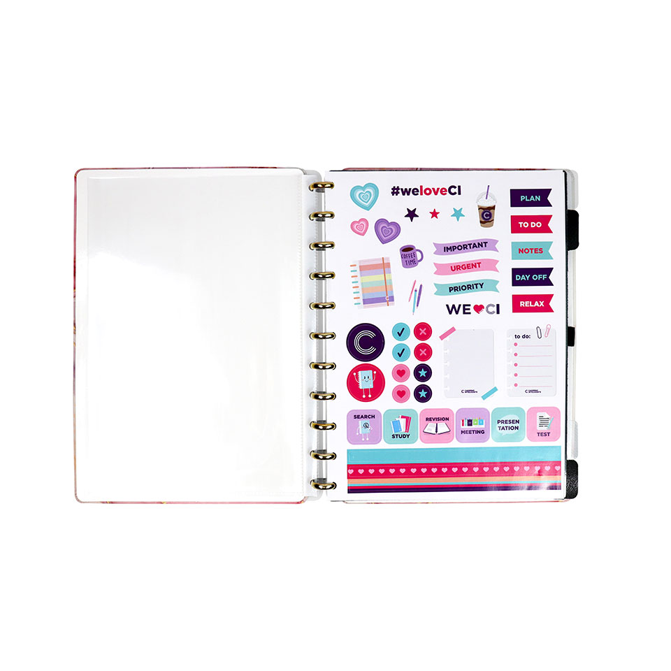 O caderno que permite tirar folhas quando quiseres! Grande: Capa e contracapa rígidas, 1 bolsa plástica, 1 folha com instruções, com recargas e acessórios da marca disponíveis no verso, 1 folha de identificação com calendário no verso,4 divisórias com abas para identificação (2 pretas e 2 transparentes), 80 folhas offset 90g (60 folhas pautadas e 20 folhas lisas brancas), 1 suporte com elástico para 1 caneta ou 1 lápis e discos M mais elástico.