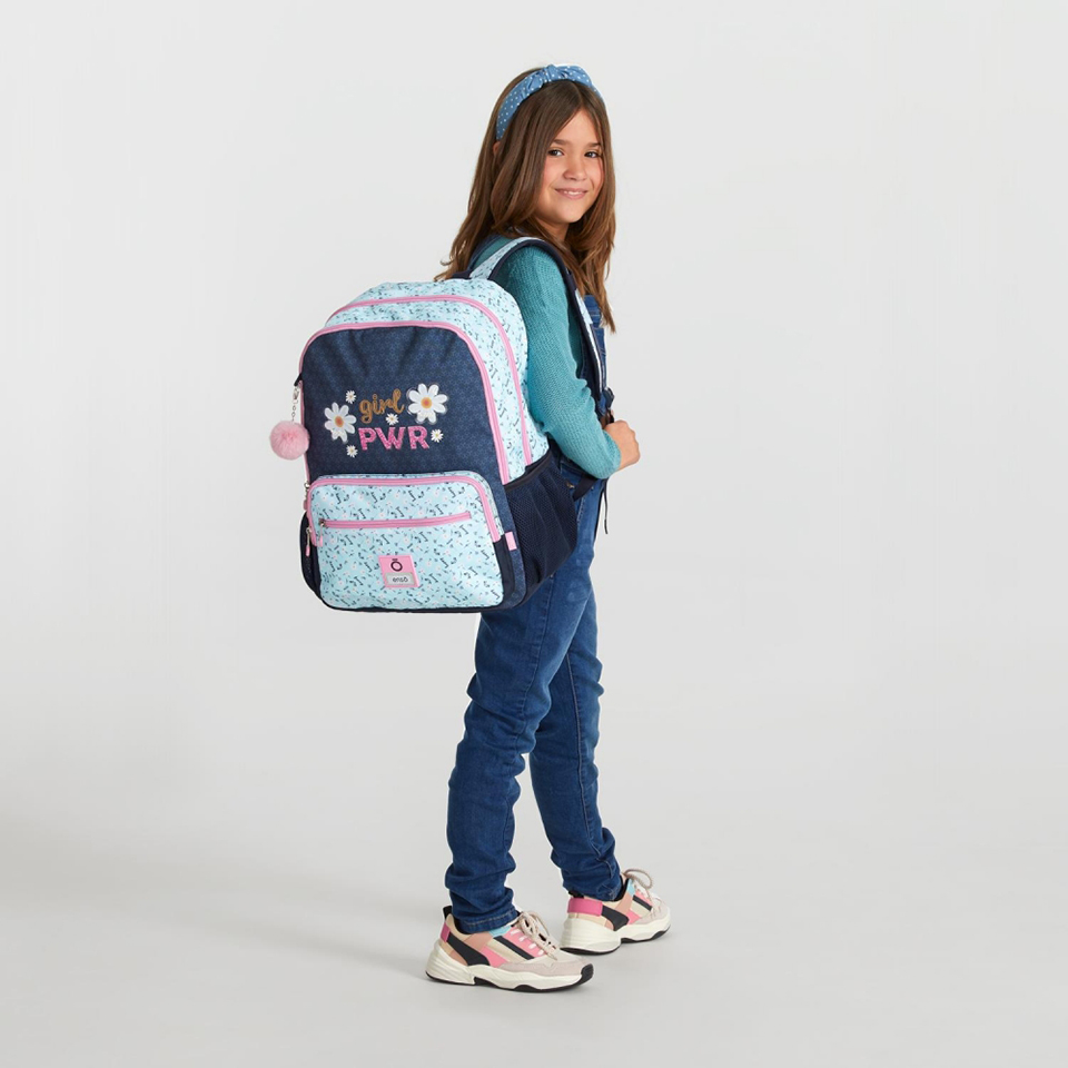 Compartimento principal duplo com saída de áudio e bolso interno para transportar o mp3 ou telemóvel. Dois bolsos frontais para melhorar a organização de pequenos acessórios e material escolar e dois bolsos laterais para guardar a garrafa de água e outros acessórios. Alças largas, ergonómicas e acolchoadas que se adaptam perfeitamente à parte de trás e faixa traseira para adaptar a mochila a um trolley .