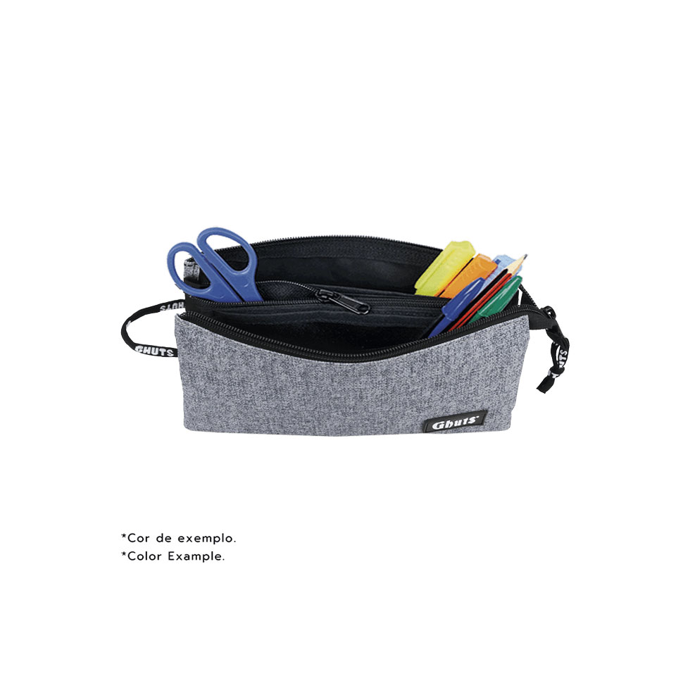 Estojo triplo. Com três compartimentos e bolsa com fecho interior.