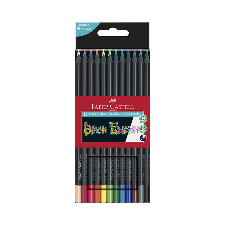 Lápis de cor Faber-Castell black edition feitos de madeira preta com chumbo super macio. Lápis ergonómicos em forma triangular para uma melhor aderência. Cores brilhantes, ótimos resultados em papel escuro e colorido.