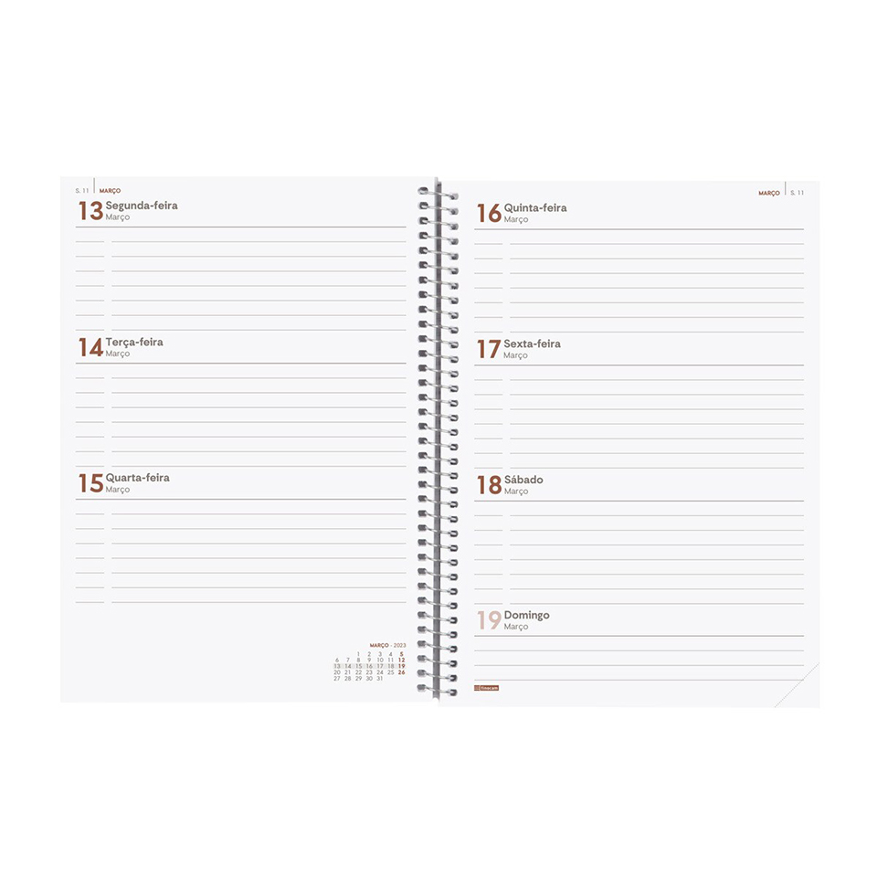 A agenda tem a duração de 12 meses, de Janeiro a Dezembro. Capas de polipropileno flexível e espiral metálica simples. Perfuração no canto inferior da folha para encontrar mais facilmente o dia em que se encontra. Papel de 70gr/m2. Fecha com elástico.