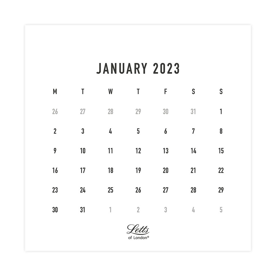 Calendário de mesa de 12 meses 2023 feito de forma sustentável com papel branco reciclado de 80g e impresso com tinta de soja. Seu verso é feito com poliéster reciclado de garrafas PET e cola vegana e tem uma frase para te inspirares durante todo o ano.