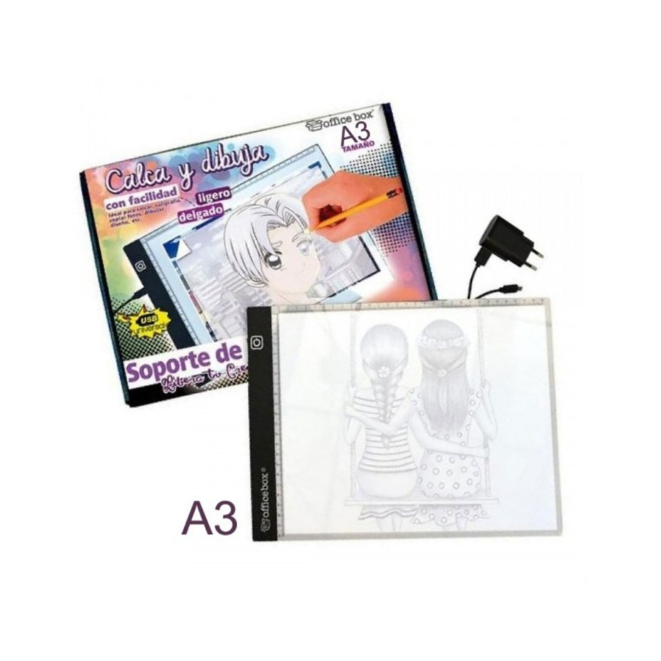 Mesa de Luz LED para desenho com três intensidades de luz ideal para caligrafia, copiar fotos, desenhar, usar-se ligado à rede elétrica com adaptador USB incluído. Intensidades de luz ajustáveis seguindo o botão. Pode-se carregar com bateria externa manual de instruções. Tamanho A3.