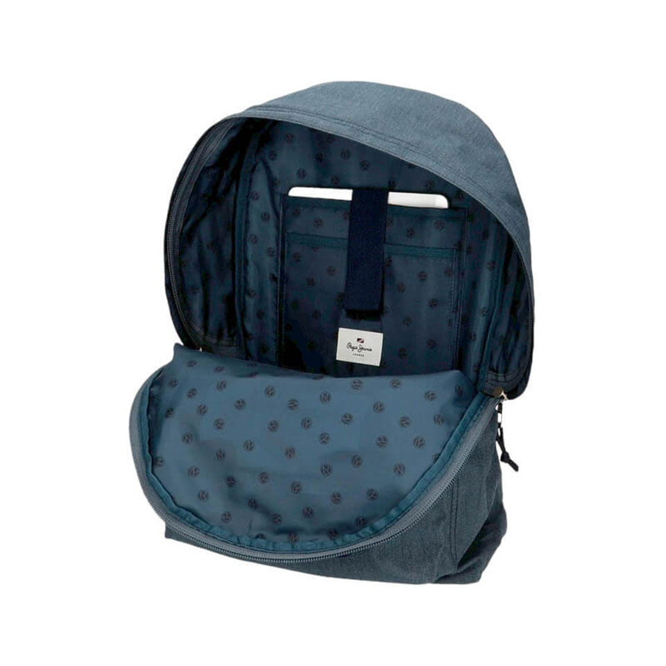 Mochila Pepe Jeans com 1 compartimento principal espaçoso com um bolso interior para guardar um tablet e outros pertences mais pequenos. Possui também um compartimento secundário na frente para coisas como carteira ou acessórios mais pequenos. Alças largas e almofadadas que se adaptam bem às costas. Pode ser convertida para o uso de um trolley.