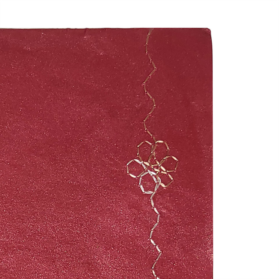Papel artesanal bordeaux acetinado com linha ondulada e flores bordadas com linha matizada dourada e prateada. Este papel é produzido de forma artesanal, poderá variar ligeiramente a cor e os elementos decorativos que o compõem. Permite impressão a laser e jato de tinta.
